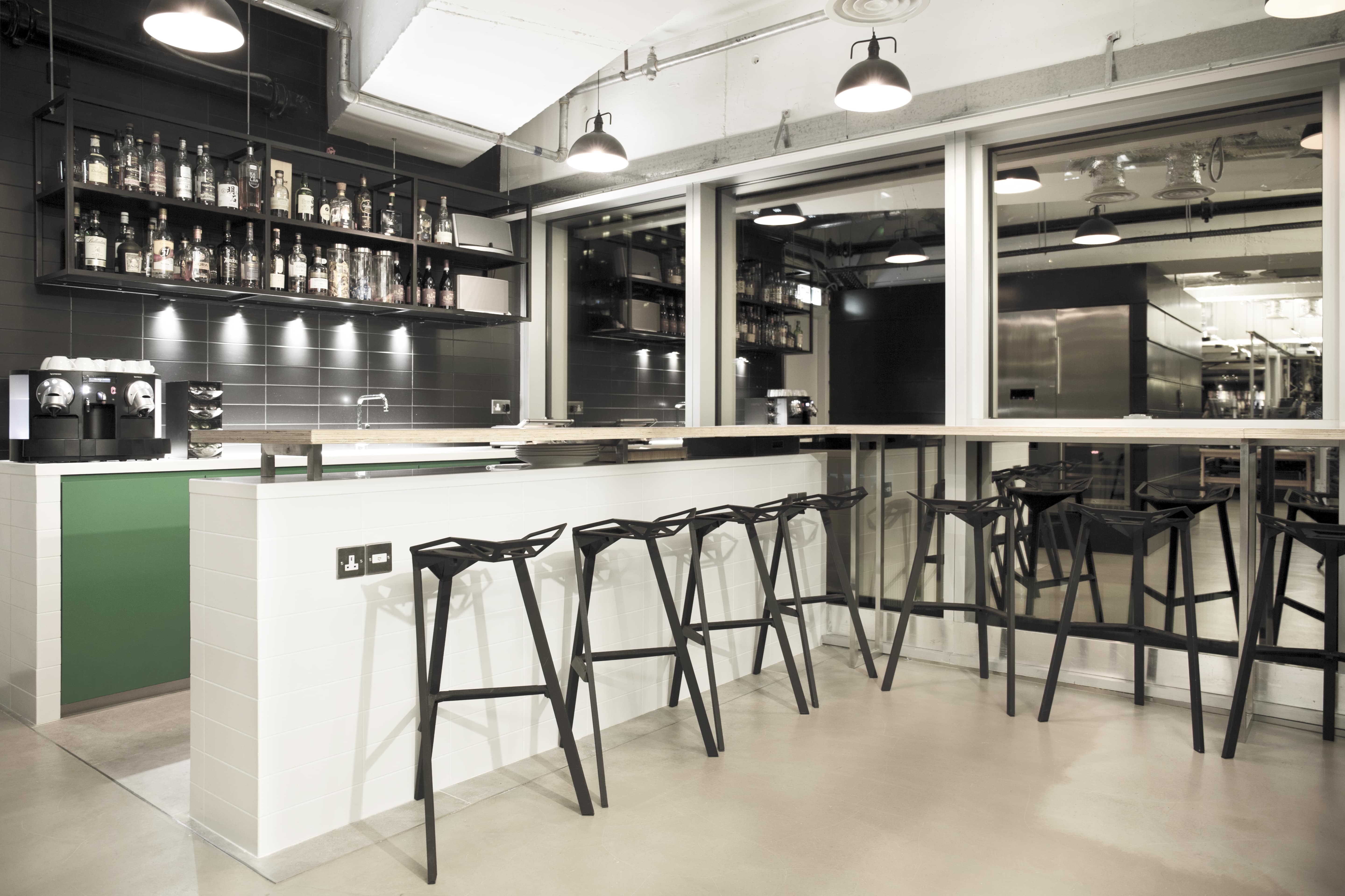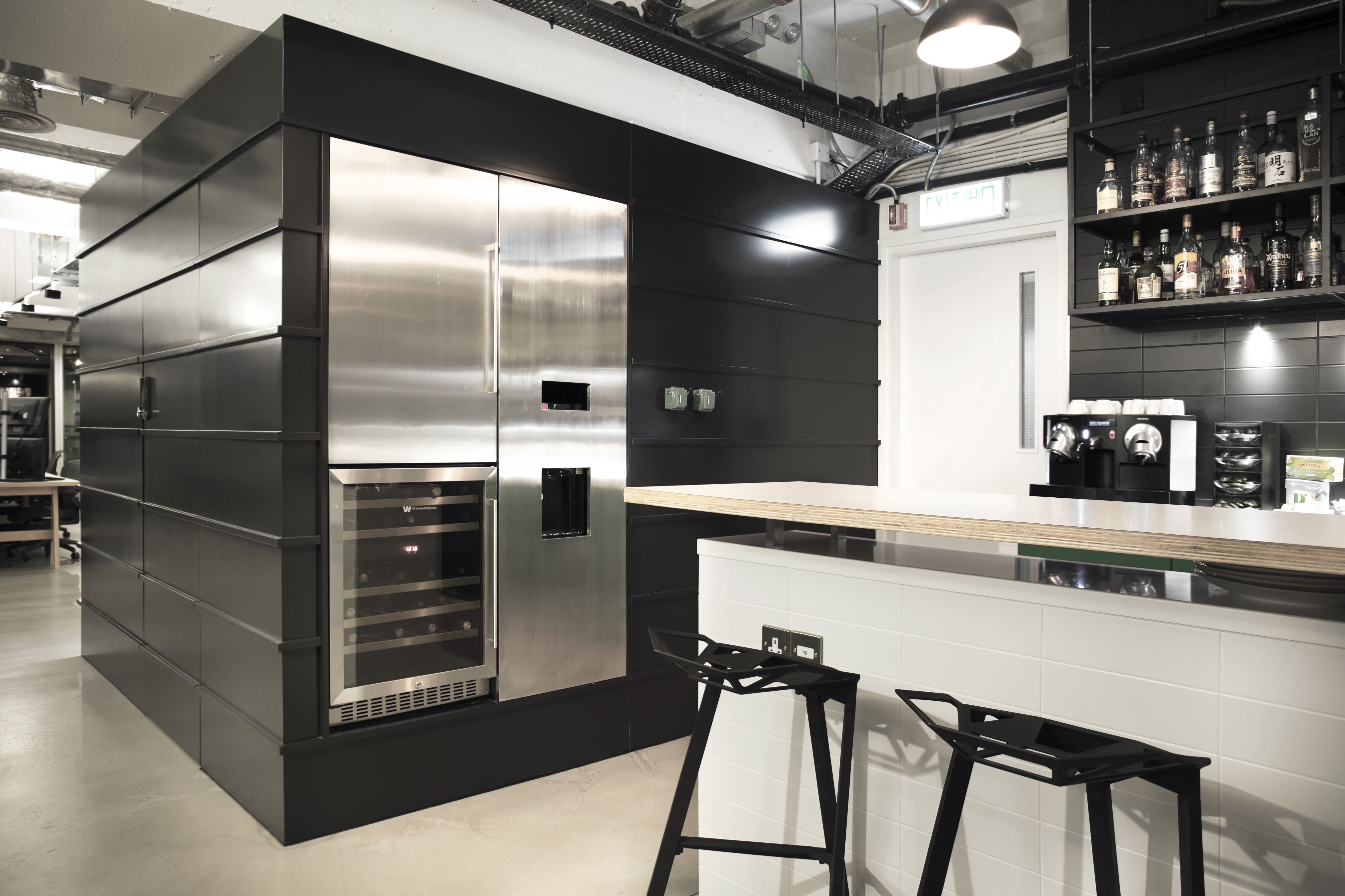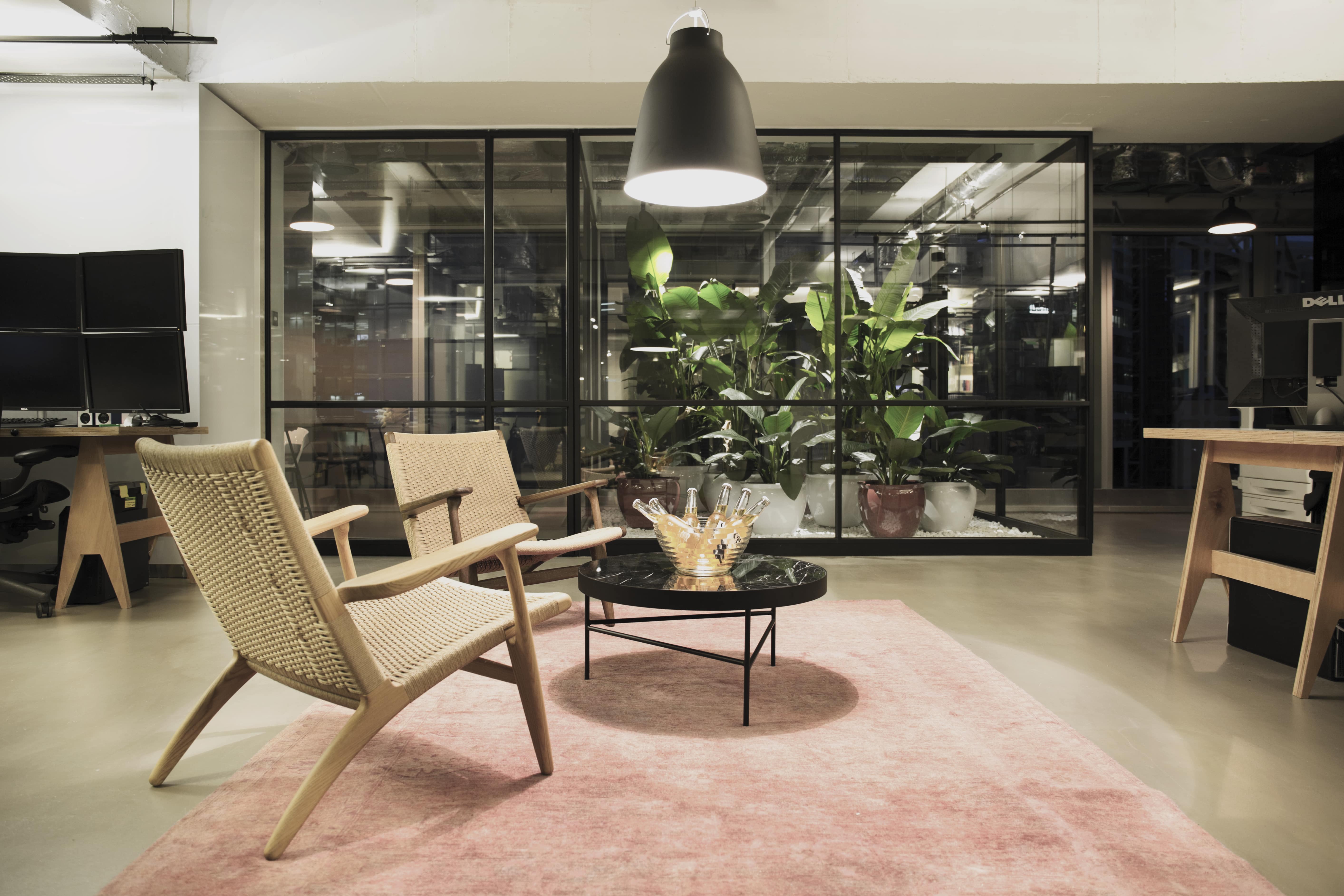 Kokomo Capital found a new home in the heart of central Hong Kong through the construction of this industrial-styled office comprised of a black cube-information centre and server space and self-produced trestle tables with 4km of cables and wires connecting the trestle work stations via flexible core cables hung from the ceiling. A lounge area, whiskey bar, games zone and interior garden complete this contemporary work domain, reflecting the ‘work hard, play hard’ philosophy of the business.