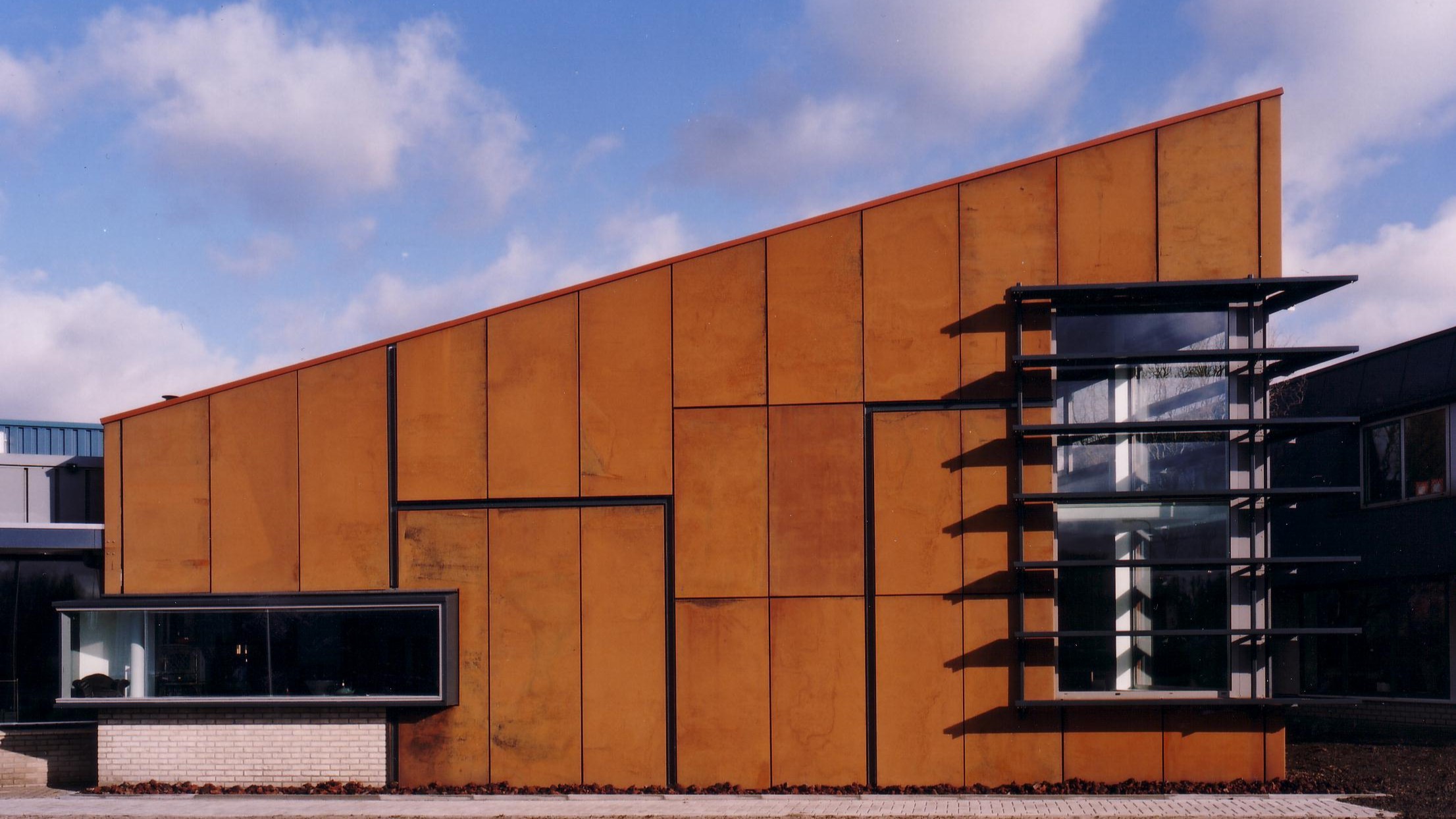 The Potgieter Company is located in the Heino Business Park. The existing, one-storey high commercial building was expanded with a new mass for a showroom in which an office space 'hangs' as an independent volume. The client wanted the new part to manifest itself in relation to the existing building. This led to the choice of special façade-cladding and to the mass of the extension: a sloping roof that transitions into a façade-finish of weather-resistant Corten steel with windows as razor-sharp solitary objects cut from the façade and two distinct joint types within the Corten steel plates. This creates a special appearance and the desired urban accent.