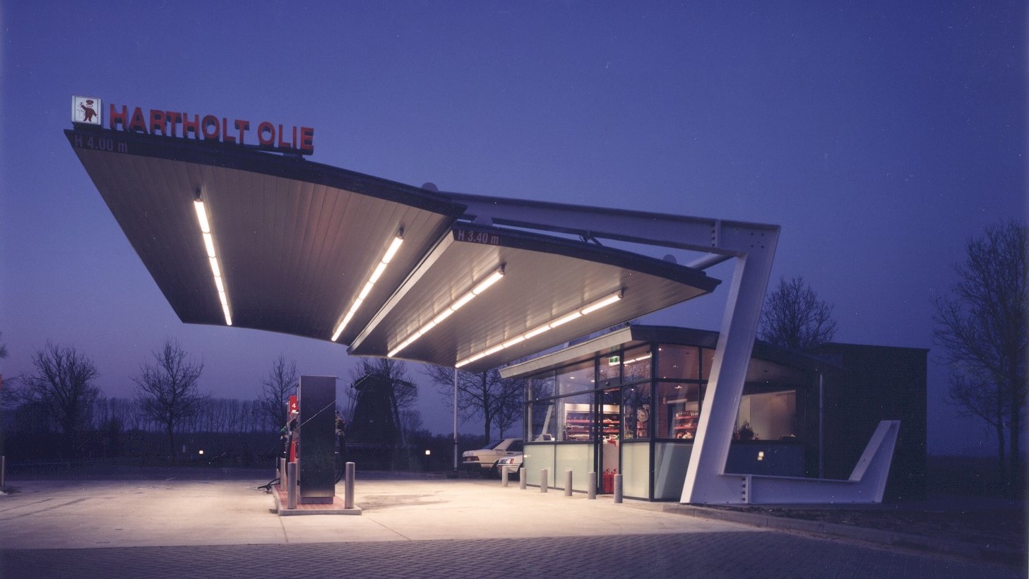 In 2000, STUDIO SITEC designed and realized a gas station and shop near the village of Windesheim. Positioned next to the busy road, but close to the historical Mill and Windesheim church, the gas station is designed as a humble technical element belonging to the dynamics of the road. It does not compete with the monuments around it and keeps clear the view of the mill. The technical object is designed as a column-free, double-curved, zinc-covered roof, hanging on a steel exoskeleton. Via two Z-shaped steel columns, the structure is connected to the shop, which acts as a counterbalance to the 11.2m cantilevered roof.